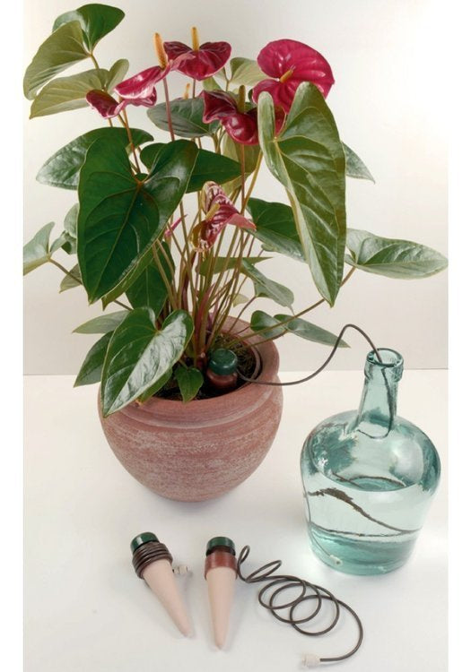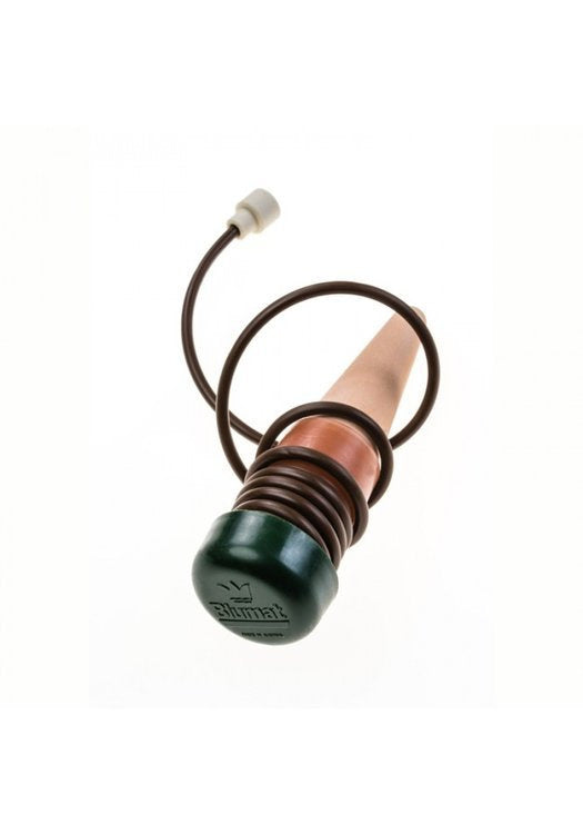 Blumat Classic watering machine for watering individual potted plants at home, on the balcony or terrace. Water supply is carried out through a clay cone, placed in a pot with a plant. If the soil surrounding the cone is dry, water is taken from the cone, which replenishes it automatically by taking it from a nearby water container via 80 cm long and 3 mm diameter syconeable water supply tubes. Thanks to the dispenser, the plant itself controls its water demand. The installation is very simple: just open the green stopper on the head and fill the cone with water, close the lid and soak the closed irrigation for 1 hour in water to allow water to soak. Then insert the ceramic cone into the soil, and the end of the silicone hose into the container with water.