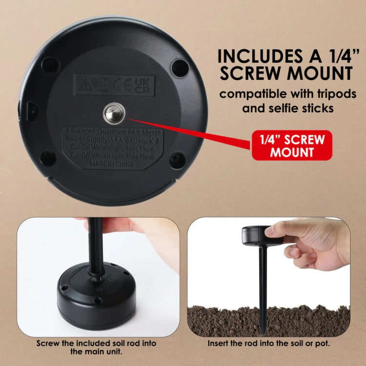 Measures PPFD (μmol/m²/s) and DLI (mol/m²/d)