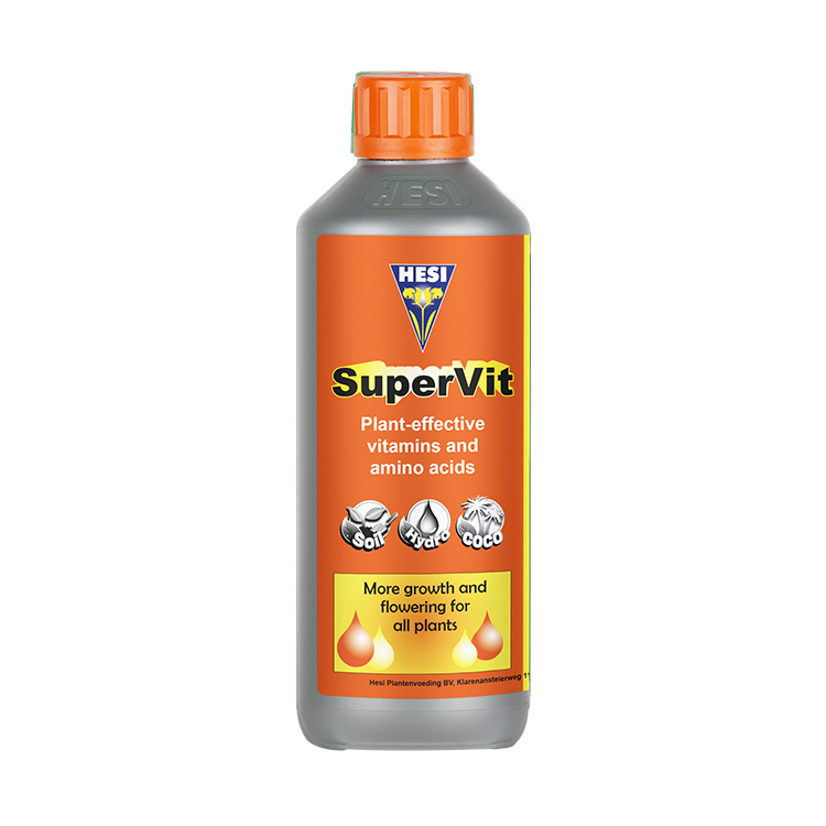 SuperVit is a mixture of 15 vitamins and 10 amino acids that play a huge role in the metabolism of the plant. SuperVit vitamins and amino acids (vital substances) are components of, among others, plant hormones, enzymes and chlorophyll. Thanks to SuperVit, we obtain an important building substance, ready for use. We no longer have to produce it ourselves, which saves our energy! Plants themselves can produce these ingredients from minerals, but thanks to Hesi SuperVit plants are provided with nutrients in a form ready to assimilate. This saves time and energy. The energy saved is felt in growth and flowering, as well as optimal immunity and health. Flower production is accelerated, light absorption by the plant improved, and metabolism becomes faster. SuperVit activates growth and flowering hormones, and is therefore suitable for all periods of plant development. Plants are healthier because they are nurtured SuperVit! They produce more powerful flowers. USING SuperVit: SuperVit is used during one full cycle. Add to water or spray. DISSUASING: One drop of SuperVit per 4.5 litres of water (=1ml for 65 L). Do not overdose! THE MAIN ADVANTAGES: -more energy for the plant -better growth and flowering -better resistance -sweet smell and intense color